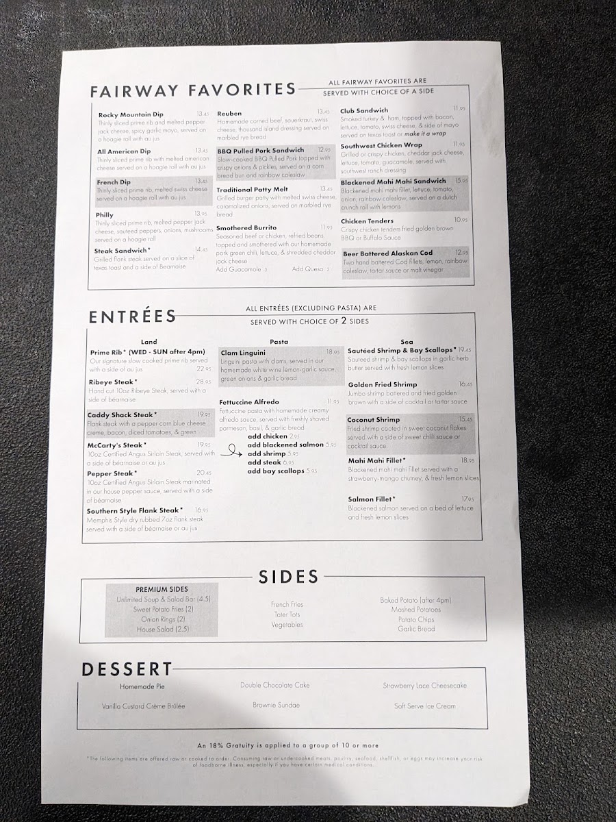Start your culinary adventure with signature Fairway Favorites like the Buffalo Chicken Sandwich or the savory Smothered Burrito. For something heartier, explore the hearty Entrees, featuring the succulent 10oz Prime Rib and the flavorful Surf & Turf. Don't miss the delightful pasta offerings such as Fettuccine Alfredo, priced at an attractive $13.95.